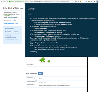 Användare kan även anpassa sina språkpreferenser via inställningssidan, vilket ger flexibilitet beroende på individuella behov. Tillägget använder standardinställningen för engelska, men det går att justera för andra språk. Notera att det finns en rekommendation att överväga den bättre underhållna efterträdaren, Contextual Wiktionary, som erbjuder fler uppdateringar och en mer aktiv utveckling.